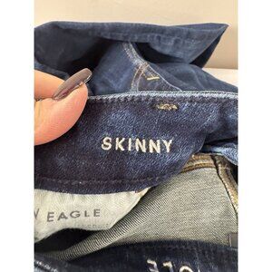 These American Eagle jeans are a cornerstone piece for the Streetwear or Grunge aesthetic. They feature a modern skinny fit with a low rise and a versatile dark wash, perfect for everyday casual style. The added elastine provides comfortable movement. They are in excellent pre-owned condition. This is a Men's size 30x30, made in Bangladesh from a blend of 98% cotton and 2% elastine. The flat-lay measurements are: a waist of 15 inches, a rise of 9.5 inches, and an inseam of 29 inches.#AmericanEagle #Streetwear #Grunge #SkinnyJeans #LowRise