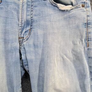 Condition: Basic 5-pocket slim tapered-leg jeans. Light wash denim. Stretch marks. Blemish on front as pictured.