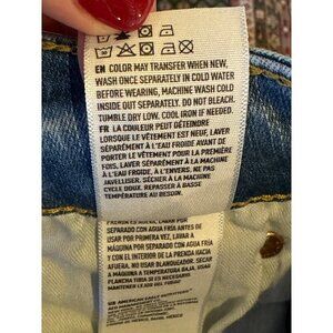 These Jeans from American Eagle are in excellent condition. They are in a blue light-wash denim fabric. They feature; a mid-waisted cut, button and zipper closure, belt loops, straight legs, slim fit and classic 5 pockets styling. They are crafted from a cotton, viscose, polyester and elastane blend.