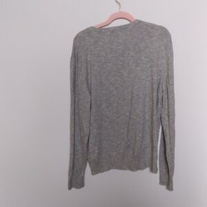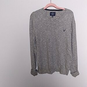 American Eagle Men's marled neutral lightweight Classic Fit V Neck Cotton Sweater with gray embroidered eagle logo on the chest