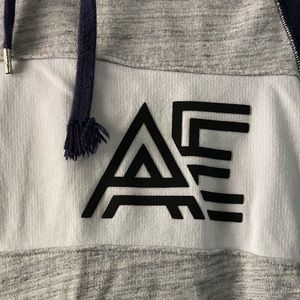 American Eagle Men’s Color-Block Hoodie. Size Small. Like new condition. Soft inside and thick material. Navy blue sleeves and hood, light grey back and front w/ white stripe in the middle. AE Logo.