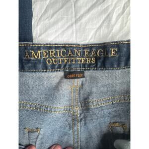 Classic and comfortable pair of American Eagle Core Flex Men's Jeans in size 34x30. Made from a soft cotton and Lycra blend, these jeans offer the perfect mix of flexibility and durability. The straight cut design provides a timeless fit, while the dark wash makes them versatile for casual wear or dressing up with a button-down.