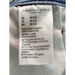 The product is a pair of American Eagle men's jeans in a blue color, made from a cotton blend denim fabric. They feature a distressed look, athletic fit, and skinny style, with a regular size 30 waist and 34 inch inseam. The jeans are branded by American Eagle Outfitters, known for their quality and trendy designs. Perfect for men looking for a stylish and comfortable pair of denim pants with a modern twist.