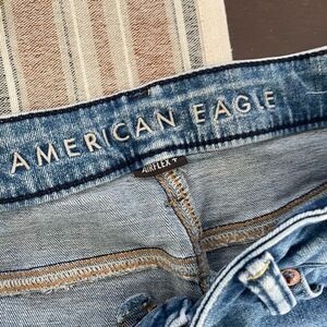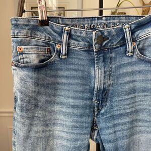 American Eagle Slim cut blue jeans. Gently preowned. Tag size 30 x 34, but these have been washed and they do typically lose some length in the laundry. These are currently measuring at 33 inch inseam.