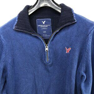 The product is an American Eagle men's knit sweater in blue, made of 100% cotton in size L. It features a 1/4 zip design, long sleeves, and a solid pattern. The sweater's style is a pullover, suitable for casual, travel, or workwear occasions.