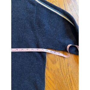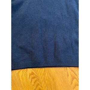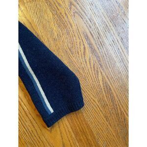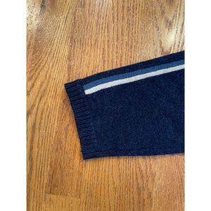 This American Eagle Outfitters men's pullover sweater is crafted from lambswool and features a mock neck with a 1/4 zip. It comes in a blue striped pattern with ribbed cuffs and hem, and includes the AE77 Performance label. Made in Sri Lanka, this regular size XL sweater is designed for dry clean only. The item is vintage and pre-owned.