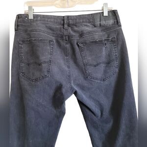 Preowned American Eagle Slim Men's Black Distress Jeans in good condition. Size 32×34