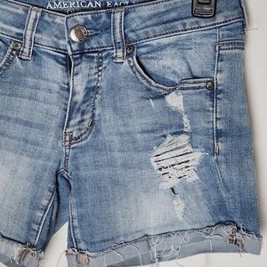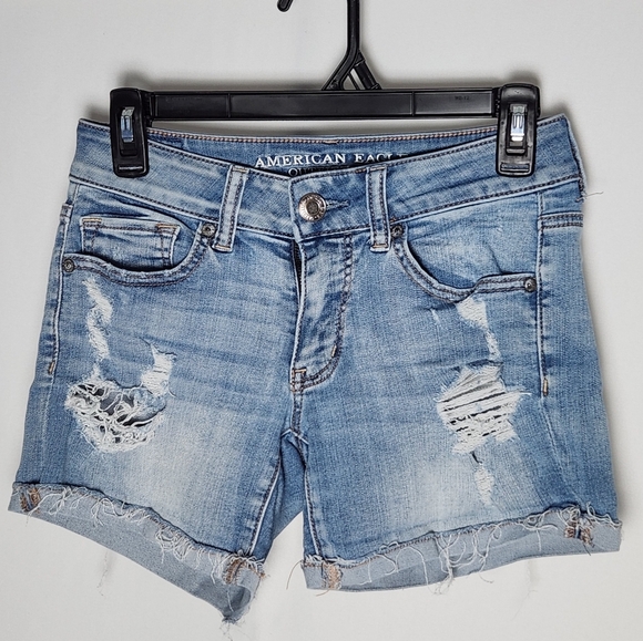 These American Eagle Outfitters jean shorts showcase a trendy distressed design with frayed edges and a vintage-inspired look. Available in various shades of blue, they offer a casual and summery vibe perfect for any laid-back occasion.
