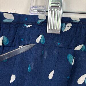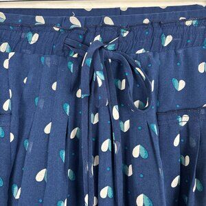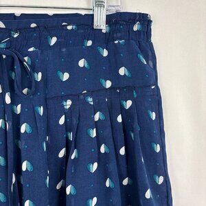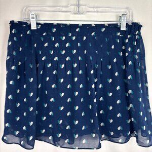 Cute and flirty American Eagle skirt in a navy blue with an allover heart and polka dot print in teal and white. Features a drawstring elastic waistband, soft lining for comfort, and a breezy sheer overlay. Please note a few small snags in the fabric and fraying on the end of drawstring — see photos for details.