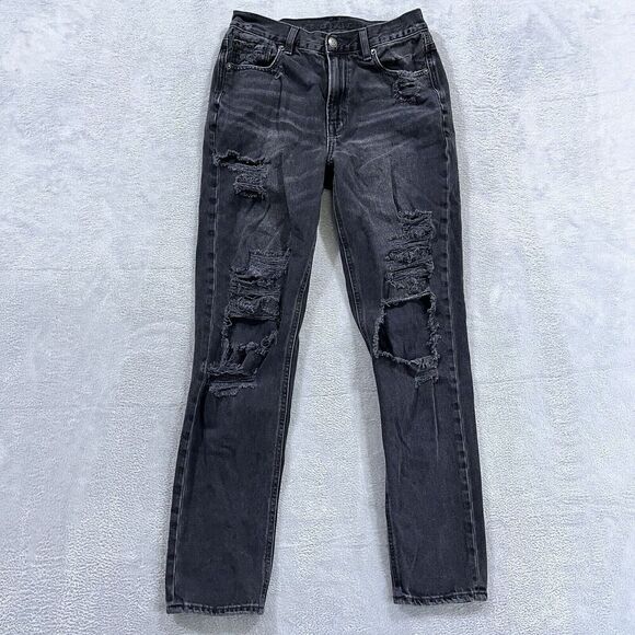 American Eagle Mom Jeans 4 Long Black Distressed Denim Womens