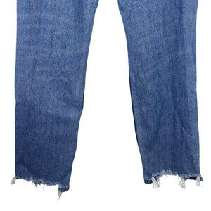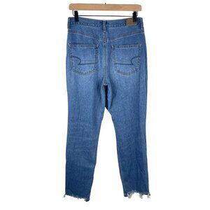 American Eagle Mom Jeans 6 High Rise Ripped Knee Tapered Leg Raw Hem Blue Denim