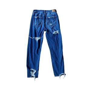 American Eagle Mom Jeans Heavily Distressed Raw Hem Dark Medium Wash Trendy Denim