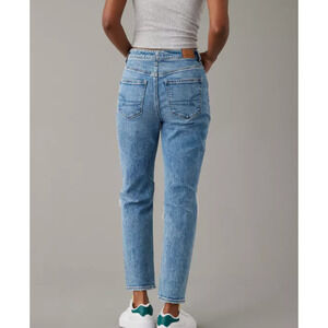 American Eagle Mom Jeans. Strigid Ripped Straight Leg High Rise Mom Jeans with Ripped Knees. High Waist Straight Leg Jeans. Medium Wash Denim. Retro 90s Style Perfect Fit Jeans. Comfortable & Flattering