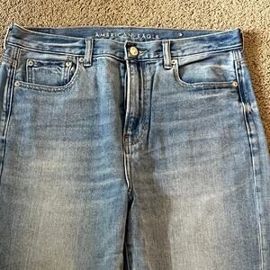 American Eagle Outfitters women’s Mom Jean in light wash denim. Classic high-rise fit with a straight leg and relaxed style. Features distressed cuffs for a casual, lived-in look. Perfect for everyday wear, styled up or down.