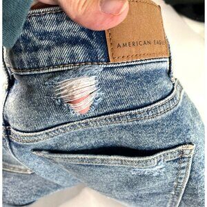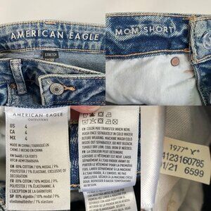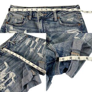 Tags: mom shorts, distressed denim, medium wash shorts, rolled hem shorts, size 4 shorts, ripped denim shorts, casual shorts, summer shorts, mid-rise shorts, stretch denim shorts, trendy denim, women's denim shorts, American Eagle shorts