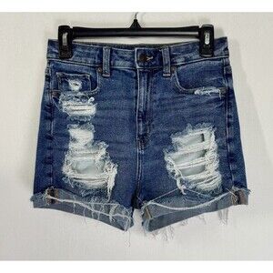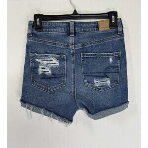 American Eagle Mom Shorts Womens 4 Blue Jean Distressed Cuffed High Rise Stretch. Excellent pre-owned condition with no flaws found. Measurements in photos. Fast shipping!