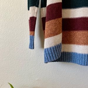 American Eagle Brand. Dark Teal, Burgundy, Orange, Cream, Light Blue Stripes. Knit. Length sits at hip. Fun and cozy. Goes well with a lot of different layering pieces.
