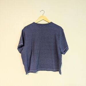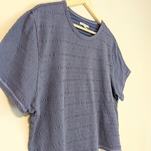 LOVE this color. Great for people who don't want to wear neutrals all summer, but aren't necessarily colorful people. The texture is so comfortable and the white stitching just adds extra tailored details. Definitely not a boring tee.