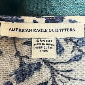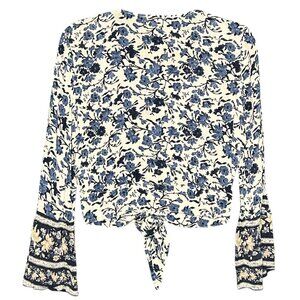New With Tags — American Eagle boho floral tie-front blouse crafted from lightweight 100% viscose. Features a soft blue and ivory floral pattern, v-neckline, flared bell sleeves with border trim, and adjustable tie front for a flattering cropped silhouette. Effortlessly feminine and flowy, perfect for festivals, beach days, or spring getaways.