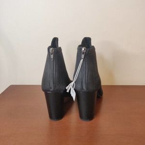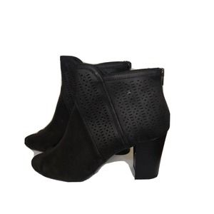 New in box women's booties in black featuring a laser cut design, inside zipper, and block heel