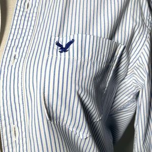 Super cute never worn AE button down. Blue & white, with a light blue denim piping on the inside sleeve cuff & gray buttons make this top that much better than your average a button down.