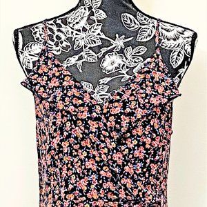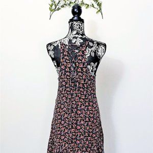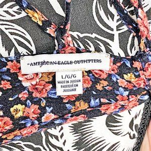 Presenting the complete essence of AEO as a gorgeous Floral Sundress! Embrace summer vibes with its vibrant black, red, and blue multi-floral design, complemented by charming ruffle edging, v-neck, lace up back, and a faux wrap detail. The true colors shine in the torso and zipper shots. Zipper is a stylish feature, not damaged. Perfect for a fashionable and lively look!