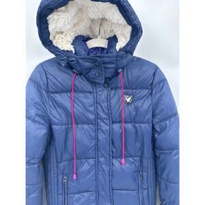 American Eagle Navy Puffer Full Zip Jacket Faux Fur Lines Sherpa Hood Size Small