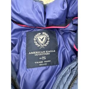 Cozy and warm American Eagle puffer jacket in navy, size Small. Features a soft sherpa-lined hood, ribbed cuffs and hem, zip-front closure with snap placket, and two zip pockets. Interior is fully lined with faux-fur accents for added warmth.