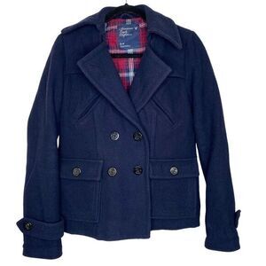 American Eagle Navy Pea Coat with Plaid Lining Warm cozy size Small