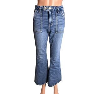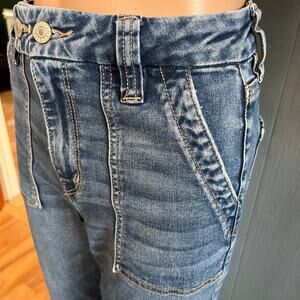 These American Eagle jeans are the next level stretch style, curvy flare. 71% cotton, 21% viscose, 7% polyester, 1% spandex. Machine wash and tumble dry. Cargo pockets, soft broken in denim. Size 4 short. Western, coastal cowgirl, festival, ranch, core, hippie.