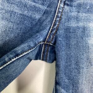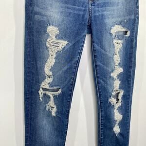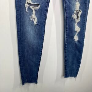 Next level stretch super hi-rise jeggings. Medium wash blue denim, factory distressing, high-waisted. Skinny legs, belt loops, pockets.