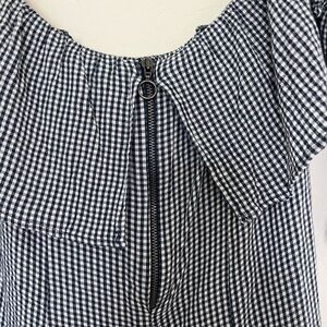 American Eagle dress size XS. Navy blue and white checkered gingham pattern. Off the shoulder style with layered ruffle sleeve. Great condition! (56)
