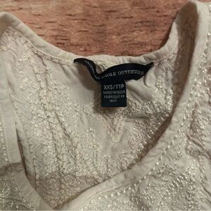 Oversized XXS, could fit a XS or S size. Used but good condition American Eagle brand. Off white/cream in color. Embroidery.