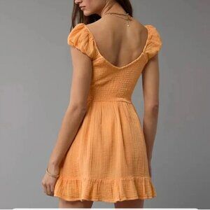 American Eagle Orange Smocked Mini Dress Puff Sleeve Ruffle Hem l Size Small