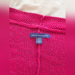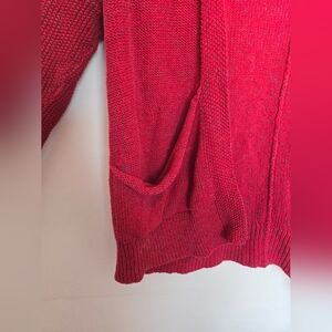 This American Eagle burgundy cardigan in size small features a relaxed fit with long sleeves and an open front design. Made of polyester knit fabric, this sweater has convenient pockets and is machine washable for easy care. The cardigan is styled in a classic red color, making it a versatile addition to any woman's wardrobe. Ideal for layering, this piece offers comfort and style with its casual, relaxed fit from American Eagle Outfitters.