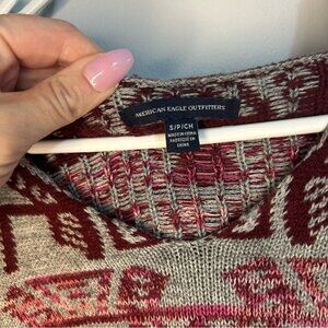 Embrace the cozy charm of this American Eagle Outfitters sweater, featuring a classic v-neck design and a festive aztec pattern in burgundy and white. Crafted with a medium-weight knit, it's perfect for cool weather, offering both comfort and style with its relaxed fit and long sleeves.