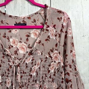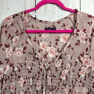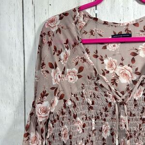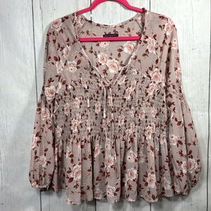 American Eagle Outfitters Babydoll Smocked V Neck Floral Peasant Pink Top Blouse