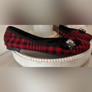 Slip On & Go!- American Eagle Outfitters Ballet Slipper- Red & Black Houndstooth Plaid- Fabric Upper- Cute Jewel & Ribbon Detail- Comfortable & Flexible- Well Padded Insole- Size 8- EUC (Like New)