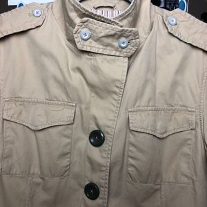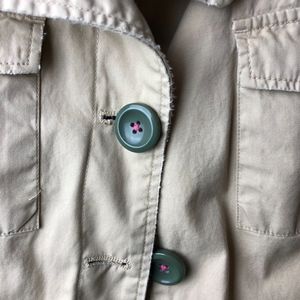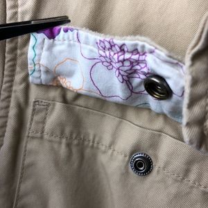 American Eagle 100% Cotton Long Sleeve Button Down Jacket Blazer, Beige Tan Cream color with striped lining and fun floral print inside all 4 pockets and shoulder tabs. Fitted, hip length, size XL. Used, excellent condition.