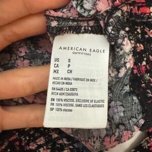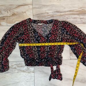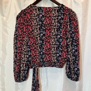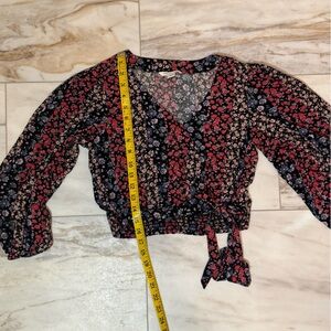 Feminine and flowy, this American Eagle floral wrap blouse is perfect for transitional seasons. Featuring a mixed pink, purple, and white ditsy floral print on black, this lightweight viscose top has a flattering V-neckline, long sleeves with elastic cuffs, and a wrap-style fit with a tie hem at the waist for adjustable styling. Pair it with high-rise jeans or a skirt for an effortlessly cute look!
