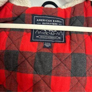 Stylish black peacoat with a quilted pattern. Features a bold red checkered lining.