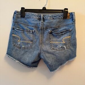 These American Eagle Outfitters jean shorts feature a trendy distressed design with a raw, frayed hem and a classic blue color. Perfect for casual summer days, they offer a comfortable fit with a stylish, worn-in look.