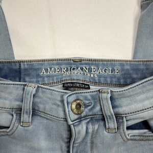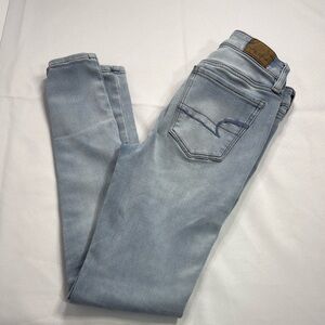 These American Eagle Outfitters skinny jeans showcase a classic blue color with subtle fading for a vintage-inspired look. Designed to fit snugly, they offer a sleek silhouette that complements any casual ensemble. The jeans' natural fading adds a touch of character, making them a versatile choice for everyday wear.