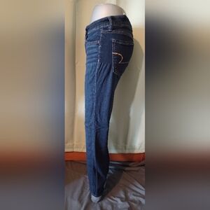 These American Eagle Outfitters jeans feature a timeless slim-leg design in a rich blue hue. Crafted from durable denim, they offer a comfortable fit and a classic look suitable for any casual occasion. See pictures. They are part of the description. There are signs of stretch puckering at the thigh and waist areas. Measurements are approximate.