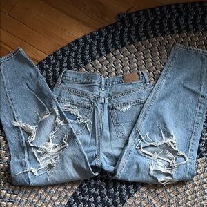 Experience timeless style with these blue straight leg jeans from American Eagle Outfitters. Crafted from durable denim, they offer a classic fit with a lived-in look, perfect for everyday wear. The subtle variations in the wash add a touch of casual elegance to your wardrobe. Relaxed mom fit, size 00