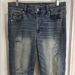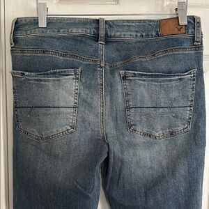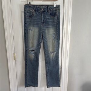 These blue straight leg jeans from American Eagle Outfitters feature a stylish distressed look with frayed rips on the knees. The medium to light blue wash and natural fading patterns give them a vintage appeal, perfect for a casual, laid-back style.