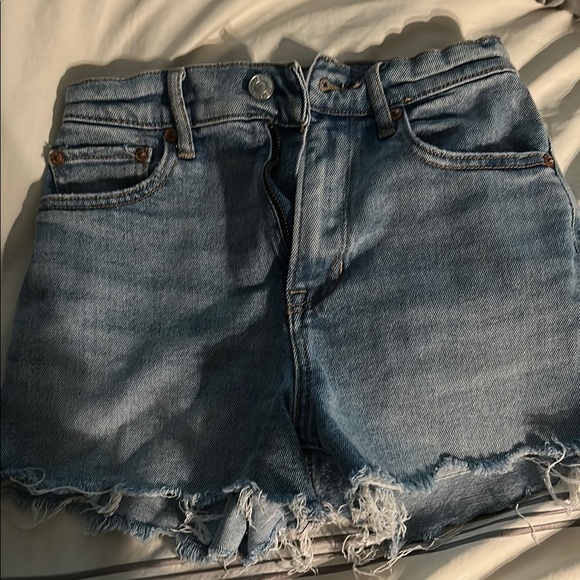 These blue jean shorts from American Eagle Outfitters boast a vintage-inspired distressed design with a raw, cut-off hem, offering a relaxed and stylish look. The medium-to-light wash enhances their classic appeal, making them a versatile choice for casual outings.