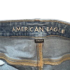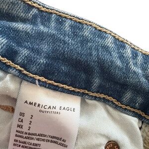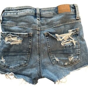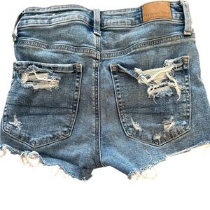 These blue jean shorts from American Eagle Outfitters boast a vintage-inspired wash with a stylish distressed design. The shorts feature frayed hems and significant distressing, offering a casual and laid-back vibe. Perfect for those who appreciate a well-worn look with a touch of modern flair.