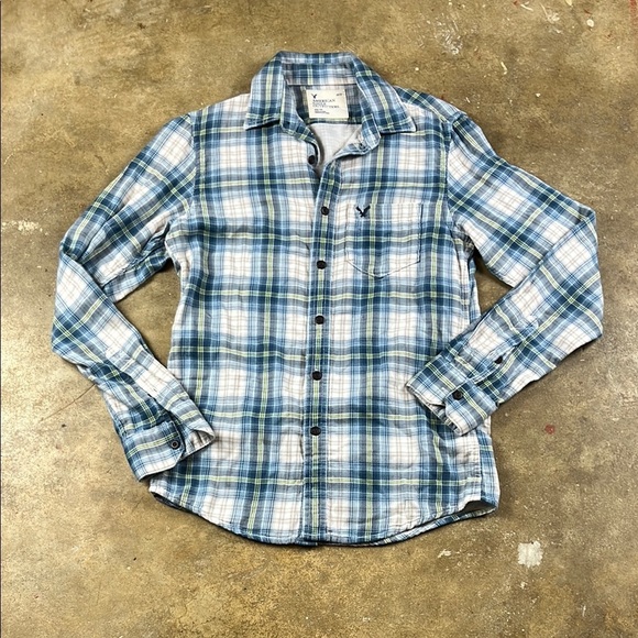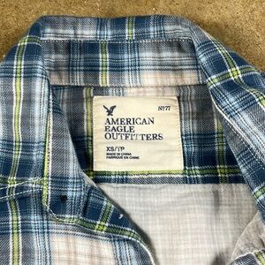 This casual button-down shirt from American Eagle Outfitters features a classic plaid design in shades of blue and white. Made from a comfortable cotton material, it is perfect for everyday wear and offers a fresh, clean appearance.