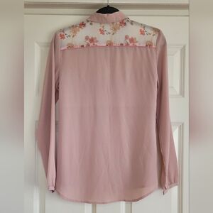 Chic blush top with floral yoke. Button-up front. Perfect for casual wear.